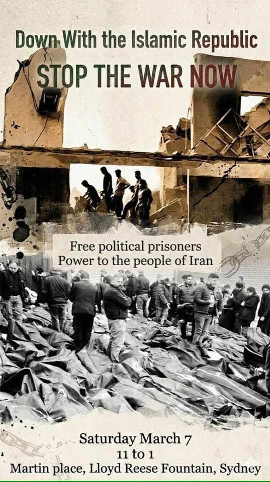 تدعوكم الحركة الاشتراكية الإيرانية في مدينة سيدني للمشاركة بالوقفة الاحتجاجية ضد العدوان الأمريكي الإسرائيلي على الشعب الإيراني انضموا إلينا يوم السبت 7 مارس 2026 في ساحة مارتن الساعة 11:00 صباحًا، ولنُسمع صوت الشعب الإيراني. البيان السياسي الرسمي للحركة الاشتراكية الايرانية في مدينة سيدني ندين بشدة عدوان الولايات المتحدة وإسرائيل على الشعب الإيراني. ولا يُعدّ هذا […]