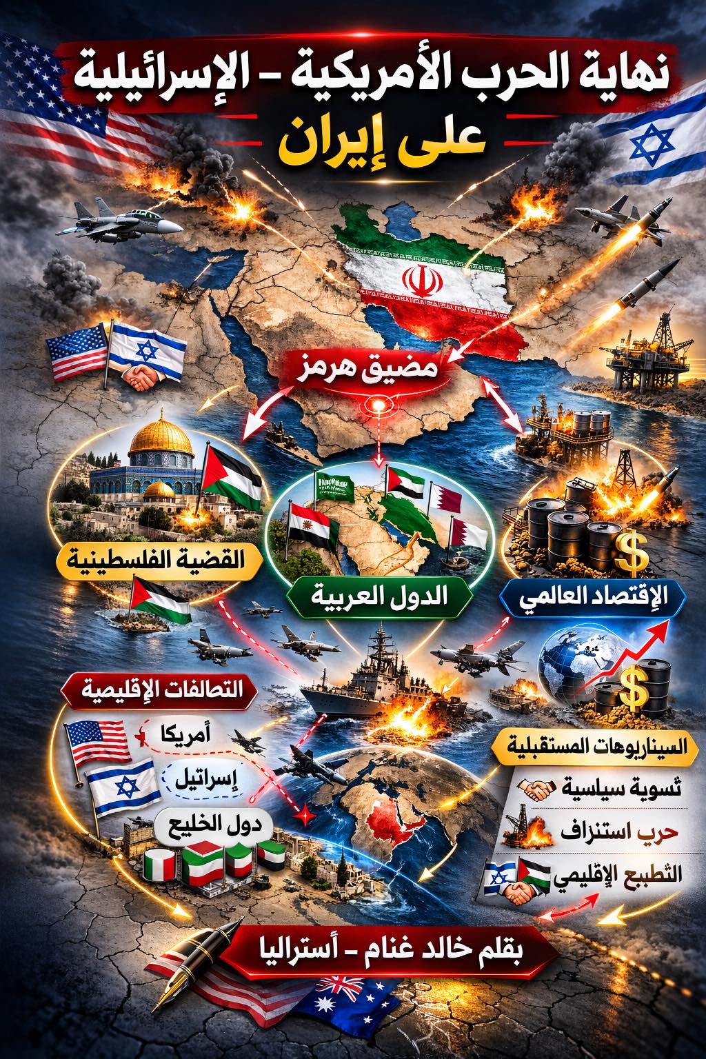 نهاية الحرب الأمريكية – الإسرائيلية على إيران: تحليل استراتيجي لتداعياتها الإقليمية بقلم خالد غنام – أستراليا 16/03/2026 المقدمة شهد الشرق الأوسط خلال السنوات الأخيرة تصعيداً غير مسبوق بين الإدارة الأمريكية وإسرائيل من جهة، وإيران من جهة أخرى، ما أدى إلى توترات عسكرية وسياسية واقتصادية واسعة. هذه الحرب لم تقتصر على المواجهة المباشرة، بل امتدت […]